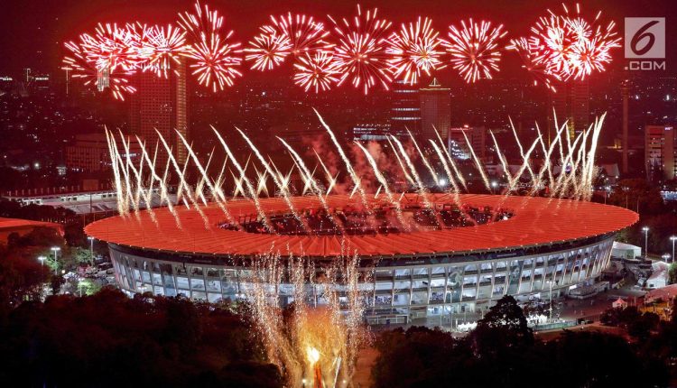 Pemandangan menakjubkan saat pesta kembang api dalam pembukaan Asian Games 2018 di Stadion Utama Gelora Bung Karno (SUGBK), Senayan, Jakarta, Sabtu (18/8). (Bola.com/Iqbal Ichsan)
