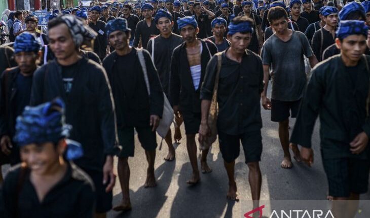 Warga Suku Badui berjalan menuju pendopo Bupati Lebak di Rangkasbitung, Lebak, Banten, Jumat (2/5/2025). Tradisi ritual Seba Badui yang diikuti sebanyak 1.750 warga Suku Badui tersebut merupakan tradisi tahunan yang digelar sebagai bentuk syukur atas hasil panen melimpah dan menjalin silaturahmi antara lembaga adat Suku Badui dan pemerintah.