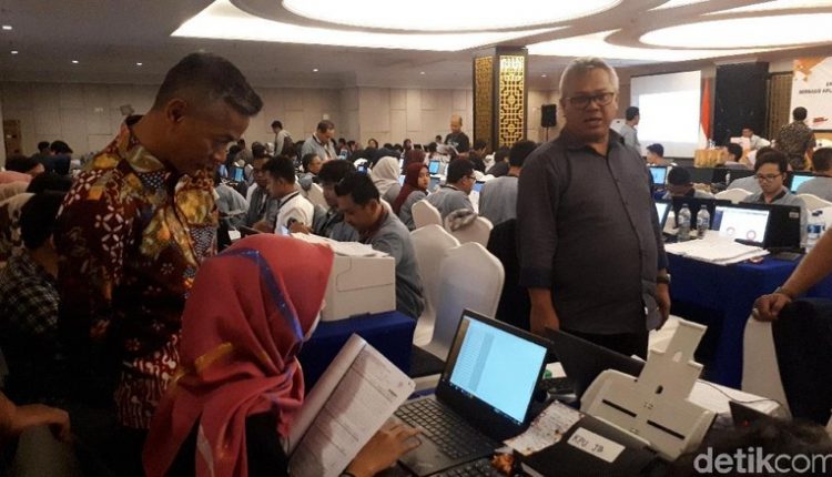 Pantauan detikcom, entri data Situng DKI Jakarta ini dilakukan di Hotel Merlyn Park, Jakarta, Kamis (18/4/2019). Pengecekan ini dilakukan langsung oleh Ketua KPU Arief Budiman didampingi oleh anggota KPU Viryan Aziz, Wahyu Setiawan, Evi Novida Ginting Manik, dan Pramono Ubaid Tanthowi.