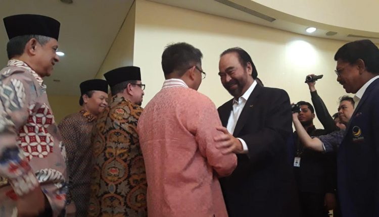 Pantauan di lokasi, Rabu (30/10/2019), Surya datang dengan wajah semringah dan langsung bersalaman hangat. Tak lupa keduanya cipika-cipiki sebelum petinggi kedua partai lainnya saling bersalaman.