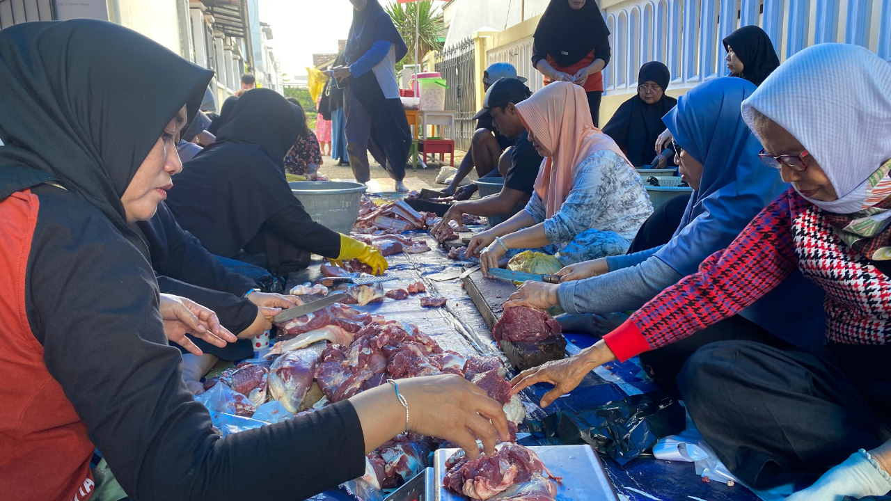 Sebagian besar proses pemotongan, pengemasan, dan pendistribusian daging kurban dilakukan oleh para perempuan. Ibu-ibu aktif dalam memotong dan mengemas daging kurban dalam suasana riang penuh semangat gotong royong.