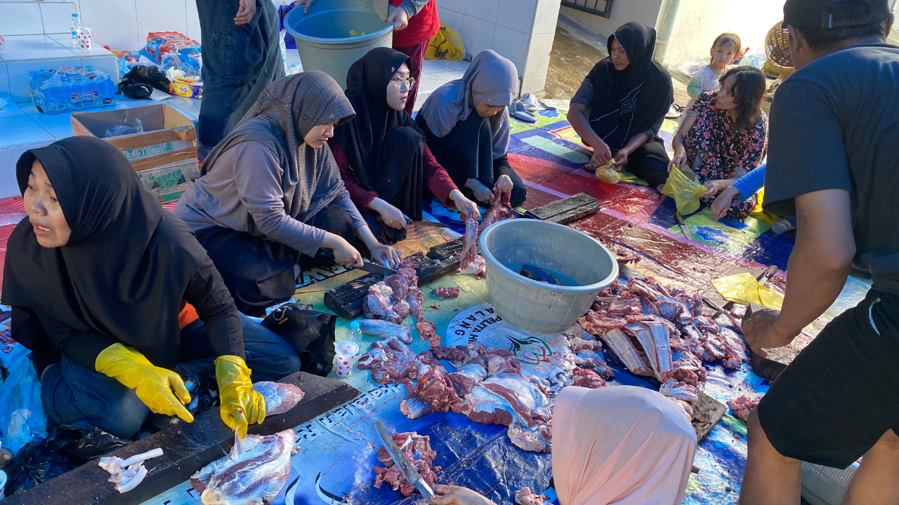 ” Kami mulai berkumpul sejak pukul enam pagi untuk sarapan bersama, lalu mulai menerima daging kurban untuk dipotong dan dikemas. Semua peran dan tanggung jawab telah dibagi jauh-jauh hari dalam rapat panitia.” Ia menambahkan bahwa sebagian kecil daging kurban dimasak sebagai konsumsi panitia dan para relawan.