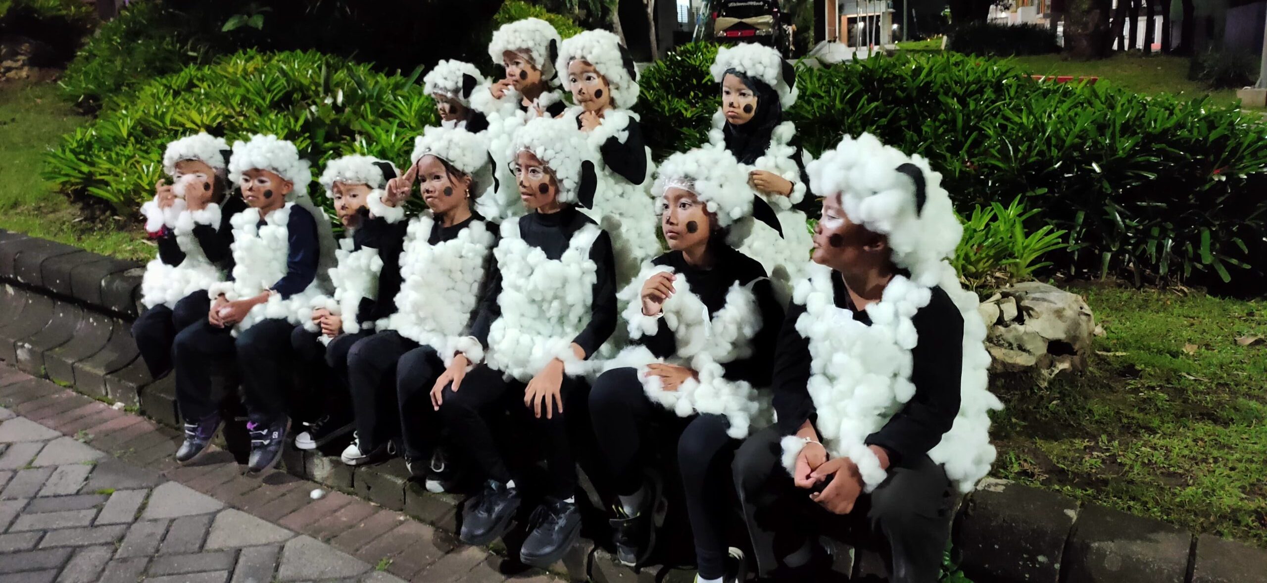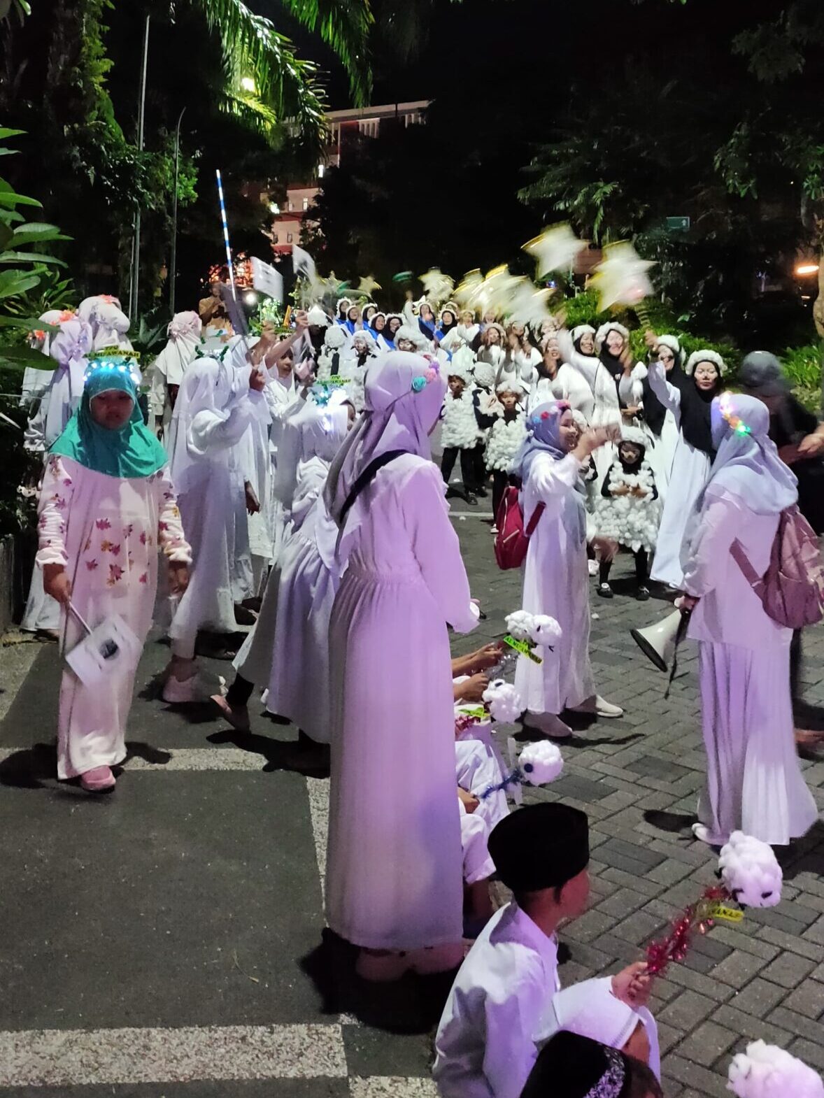 Para guru dan ibu-ibu turut mendampingi mereka dengan mengenakan busana seragam berwarna putih yang melambangkan kesucian, sambil membawa lampion berbentuk bintang bercahaya yang dibuat sendiri dengan kreatifitas indah.