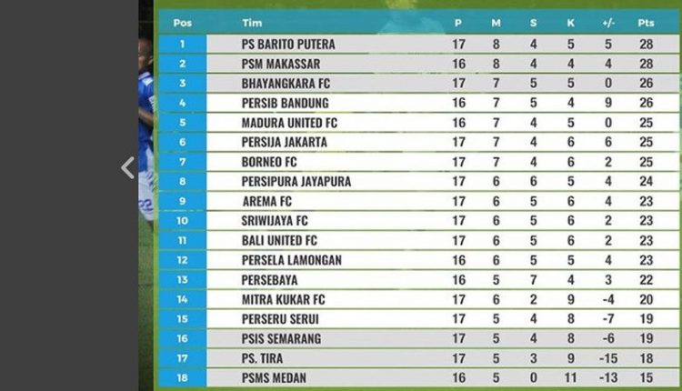 Di bawahnya, berderet Bhayangkara FC (26 poin), Persib Bandung (26 poin), Madura United (25 poin), dan Persija Jakarta (25 poin).