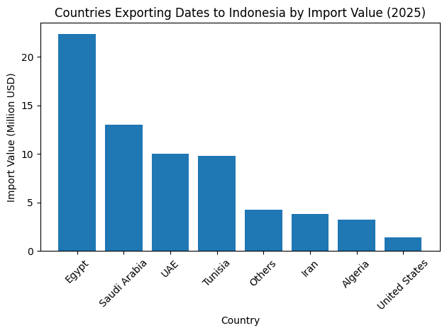 يأتي معظم التمور المتداولة في السوق الإندونيسية من دول الشرق الأوسط وشمال أفريقيا. وتتصدر مصر قائمة الدول المصدّرة للتمور إلى إندونيسيا، حيث حافظت على موقعها كأكبر مورّد للتمور خلال السنوات الخمس الماضية.