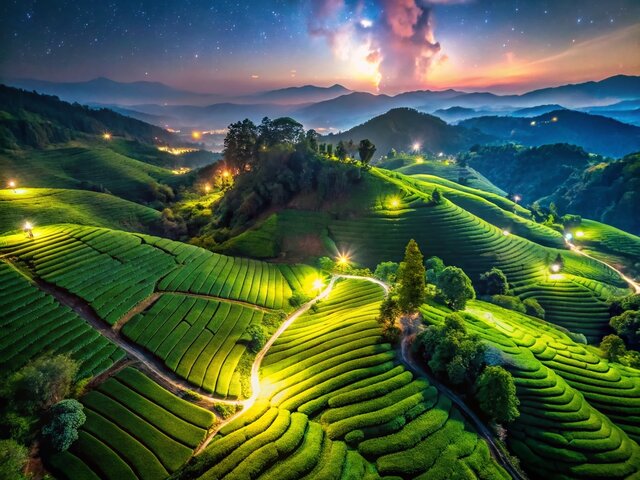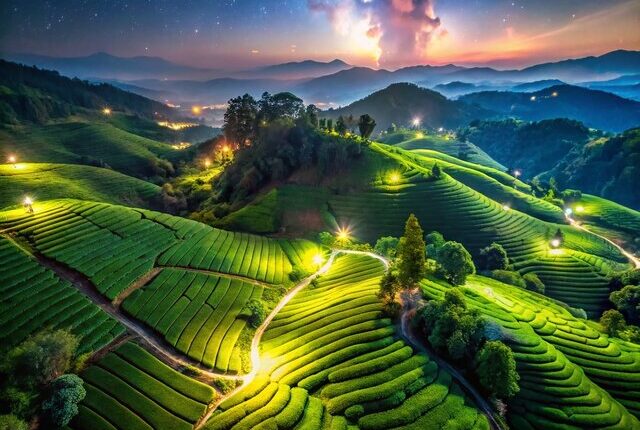 منظر جوي ليلي لمزارع شاي واليني الخضراء الكثيفة في رانكابالي، تسيويدي، باندونغ، جاوة الغربية، إندونيسيا (الصورة: ادوبي)