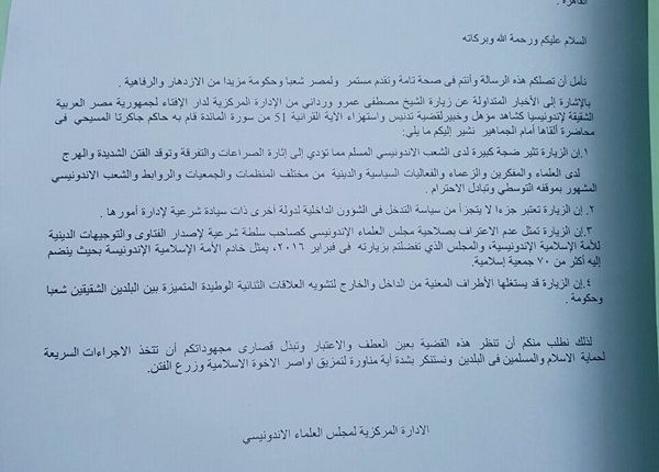 حصل موقع “إندونيسيا اليوم” على نسخة من رسالة  منسوبة لمجلس العلماء الاندونيسي والتي تم إرسالها إلى شيخ الأزهر الدكتور أحمد طيب ردا على  زيارة الشيخ الدكتور عمرو الوراداني مدير إدارة التدريب بدار الافتاء المصرية  إلى اندونيسيا الاثنين (14/11).
