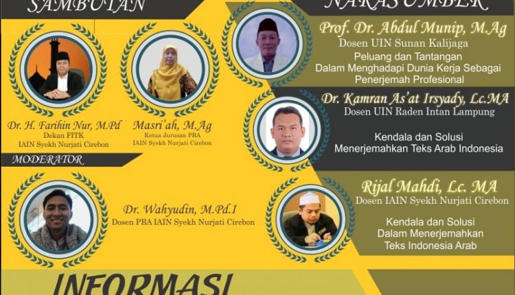 شيربون، إندونيسيا اليوم – نظّم قسم تعليم اللغة العربية التابع بكلية العلوم التربويّة وإعداد المعلمين بجامعة الشيخ نور جاتي الإسلامية الحكومية بمندينة شيربون ندوة وطنيّة حول فرص العمل وتحدياته كالمترجمين المحترفين، وذلك بتاريخ 11-08-2020 م الموافق 21 ذي الحجة 1441 هـ. أفادت الأستاذة/ مسرعة التي ترأس القسم بأن الندوة سعي من مساعي القسم في إعداد طلاب القسم وطالباتها ليكونوا مترجمين محترفين يتلاوم مع سوق العمل في المستقبل، إلى جانب تخصصاتهم في مجال التعليم تدريس اللغة العربية، لأن سوق العمل مفتوح بشكل كبير لانفتاح العالم وتقارب المسافات بين الدول.