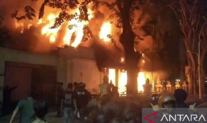 جاكرتا، إندونيسيا اليوم — أُحرق مبنى «غراهدي» الحكومي، وهو مجمّع الإقامة الرسمي لحاكم جاوة الشرقية في شارع رايا جوبينور سوريو بسورابايا، من قبل حشد مساء السبت، يوم ٣٠ آب/أغسطس عام ٢٠٢٥، وبدت ألسنة اللهب مرتفعة في الجهة الغربية من المبنى وفق مشاهدات ميدانية.