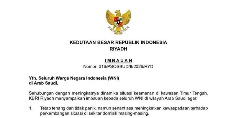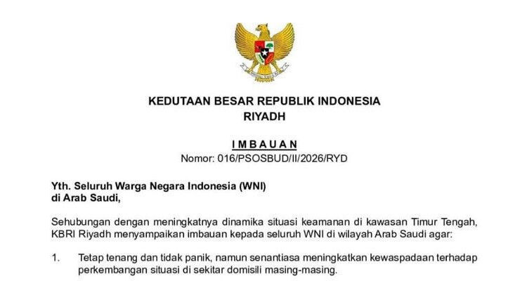 Dalam surat bernomor 016/PSOSBUD/II/2026/RYD tertanggal 28 Februari 2026, KBRI Riyadh meminta WNI tetap tenang dan tidak panik, namun meningkatkan kewaspadaan terhadap perkembangan situasi di lingkungan masing-masing.