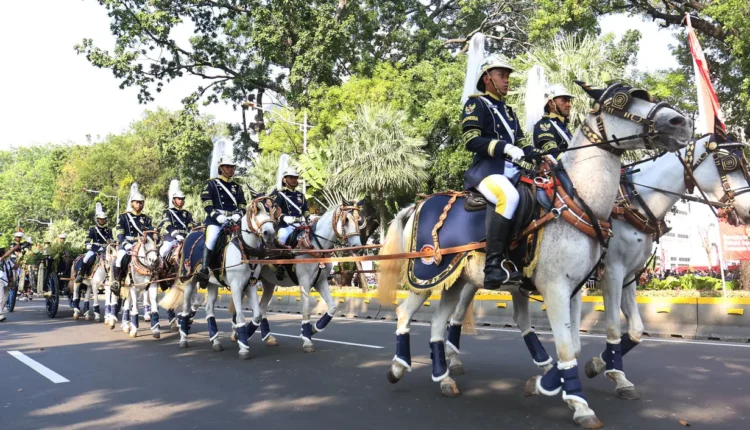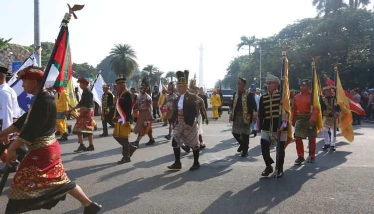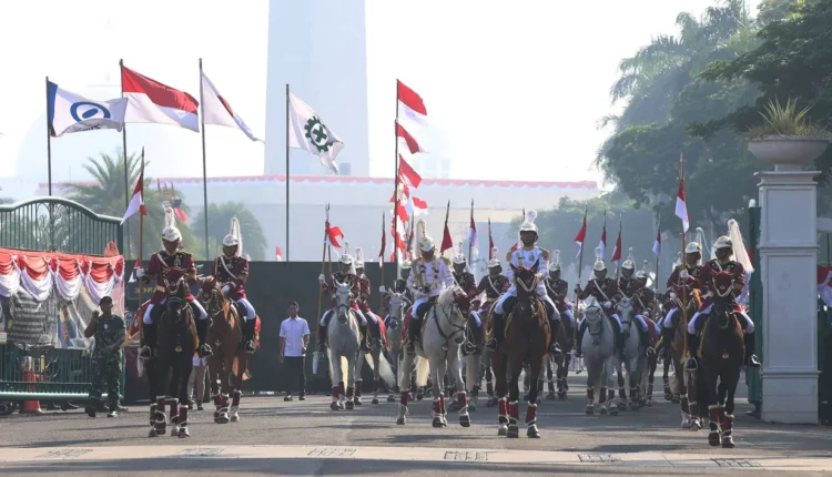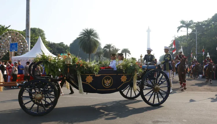 جاكرتا، ١٧ أغسطس ٢٠٢٥، إندونيسيا اليوم – شهدت العاصمة جاكرتا تنظيم موكب مهيب لعلم التراث ونص الإعلان، وهو تقليد سنوي يحمل دلالات رمزية عميقة، إذ يمثل تكريماً وحراسة للوثائق التاريخية المتمثلة في علم الأحمر والأبيض والنص الأصلي لإعلان استقلال عام ١٩٤٥، حيث نُقلت نسخها من ميدان النصب التذكاري الوطني (موناس) إلى قصر الاستقلال.