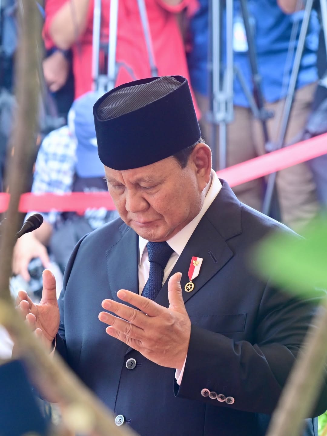 “أنا رئيس جمهورية إندونيسيا، وباسم الدولة والشعب والقوات المسلحة الإندونيسية، أقدّم إلى تراب الوطن روح وجسد وخدمات الفقيد تري سوتريسنو، نائب رئيس جمهورية إندونيسيا السادس للفترة 1993–1998، وقائد القوات المسلحة للفترة 1988–1993، نجل المرحوم سوباندي. نسأل الله أن يتغمّده بأفضل مقام عنده.”