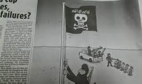 وتظهر الكاريكاتور التي نشرت في عدد الثالث من تموز (يوليو) رجلا يرفع علما كتب عليه بالعربية “لا اله الا الله” فوق جمجمة ومقاتلين ممددين بسلاحهم على الارض واحدهم يصوب فوهة سلاحه على اشخاص معصوبي العيون ومكبلي الايدي خلف الظهر.