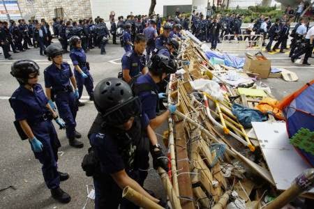 الشرطة تزيل حاجزا وضعه محتجون مطالبون بالديمقراطية في هونج كونج يوم 11 ديسمبر كانون الأول 2014. تصوير: لياو تشوتج رين – رويترز