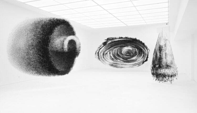 Dari kejauhan, karya-karya tersebut tampak seperti lukisan dua dimensi—seolah digambar dengan tinta hitam atau bahan alami seperti kopi. Namun ketika didekati, bentuknya justru terasa meruang, bergerak, dan hidup. Jaring yang semula datar berubah menjadi struktur visual yang berada di antara dua dan tiga dimensi, menciptakan ilusi optik yang ambigu.