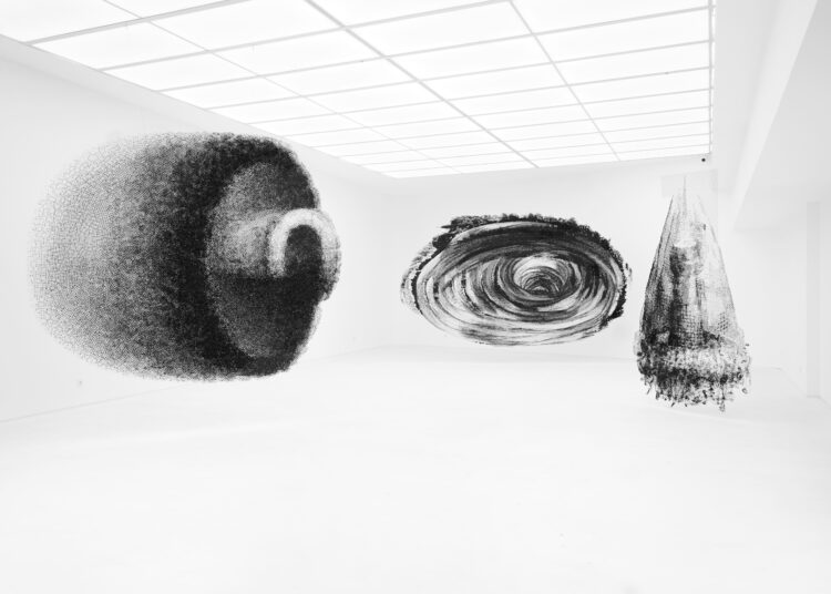 تنطلق عملية الإبداع في المعرض من رسومات فحمية على الورق، قبل أن يعاد تركيبها وتكبيرها داخل الفضاء المعماري. ومن مسافة بعيدة، تبدو الأعمال مسطّحة وملتصقة بالجدران، لكن مع الحركة حولها، يشعر الزائر بأنها تتموّج وتنحني، وتغيّر شكلها تبعًا لزاوية الرؤية، في تجربة تحاكي طبيعة الباياو نفسها بوصفه حالة وسطية غير مستقرة.