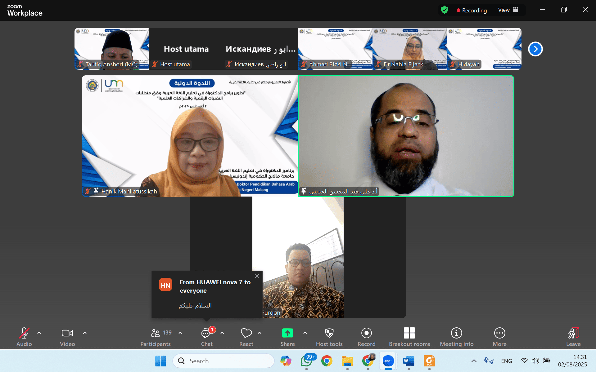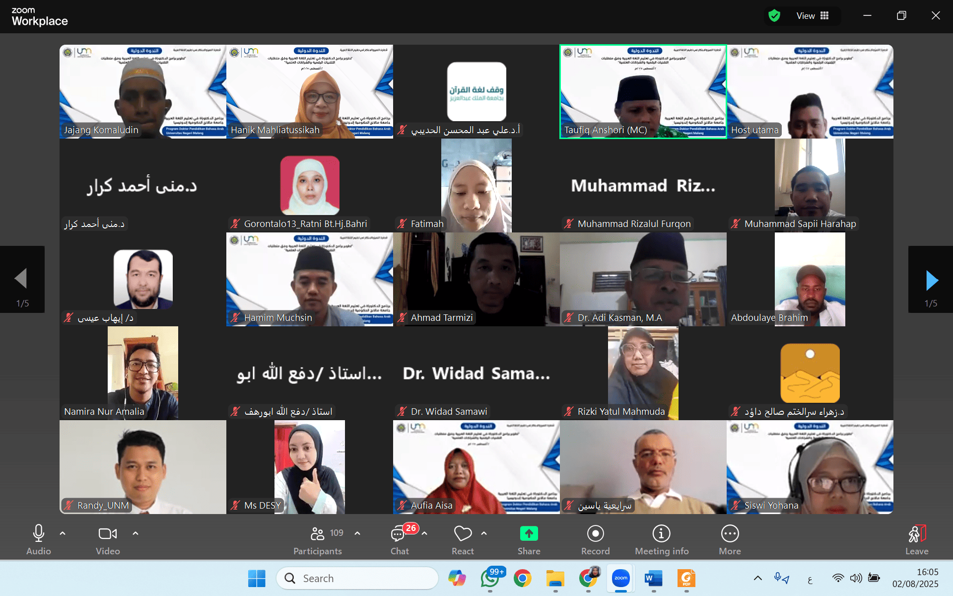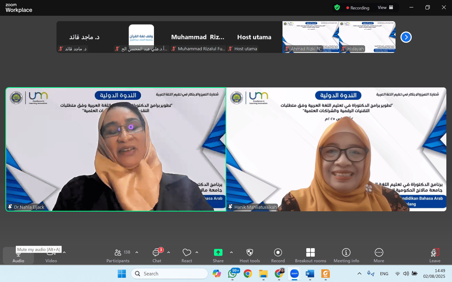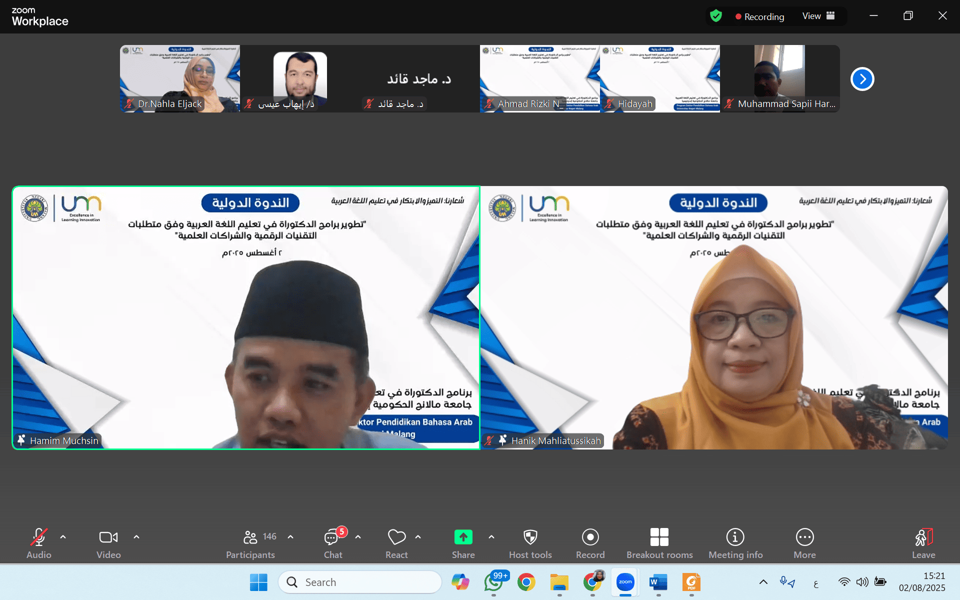 واستضافت الندوة البروفيسورة الدكتورة هنيء محلية الصحة، رئيسة برنامجي الماجستير والدكتوراه في تعليم اللغة العربية والرئيسة العامة لرابطة أقسام تعليم اللغة العربية في إندونيسيا (PPPBA)، حيث شددت في كلمتها الافتتاحية على أهمية الابتكار والتفكير التحويلي والقيادة الأكاديمية في إعداد جيل من الباحثين في اللغة العربية القادرين على مواكبة التطورات التكنولوجية والاستجابة لمتطلبات الساحة العلمية العالمية.