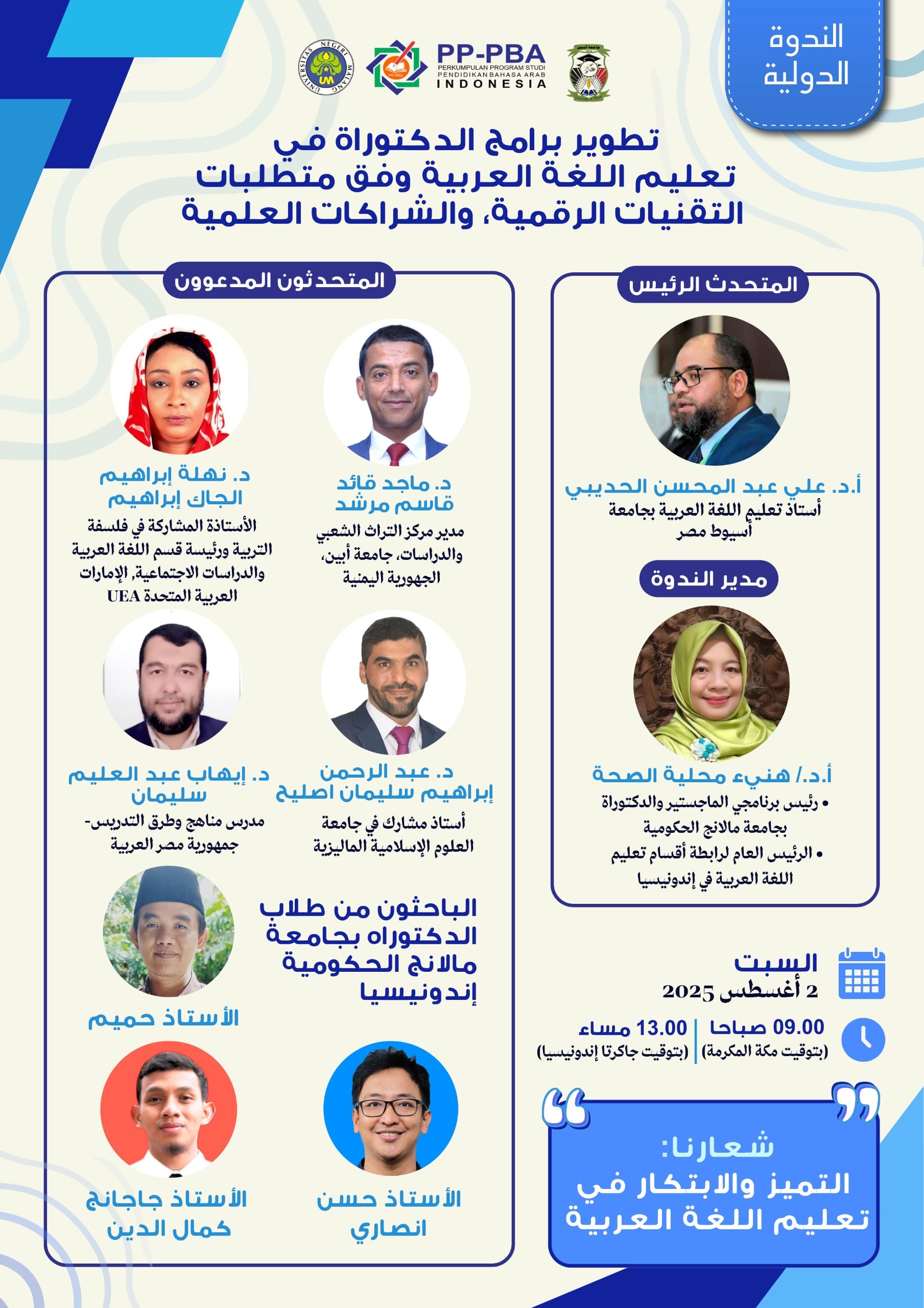 وانعقدت الندوة تحت عنوان «تطوير منهج قائم على التكنولوجيا الرقمية والشراكة لبرنامج الدكتوراه في تعليم اللغة العربية»، يوم السبت ٢ أغسطس/آب ٢٠٢٥، وجذبت أكثر من ١٥٠ مشاركاً من طلاب اللغة العربية وأعضاء هيئة التدريس من جامعات إندونيسية ومؤسسات تعليمية خارج البلاد، ما عكس اهتماماً واسعاً بمستقبل برامج الدراسات العليا في هذا الحقل.