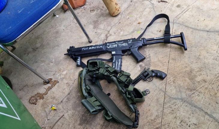 وعُثر في الموقع على أشياء تشبه أسلحة نارية من نوع «إيرسوفت غن» إضافة إلى مسدس دوّار، وتبيّن بعد الفحص أنها ألعاب وليست حقيقية.