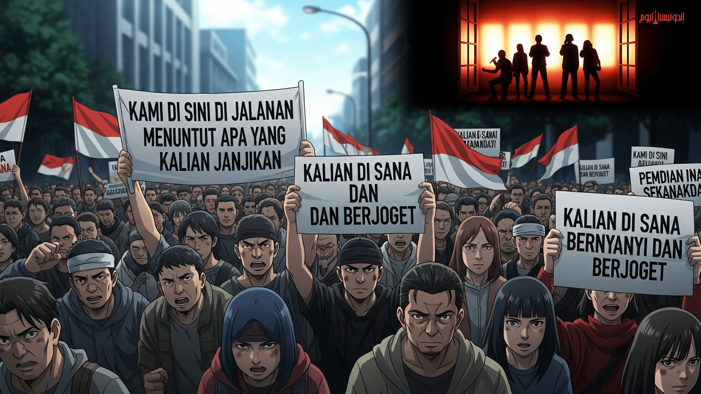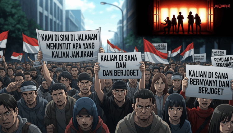 نَحْنُ هُنَا فِي ٱلشَّوَارِعِ نُطَالِبُ مَا وَعَدْتُمُونَا، بَيْنَمَا أَنْتُمْ هُنَاكَ تَتَغَنَّوْنَ وَتَرْقُصُونَ.